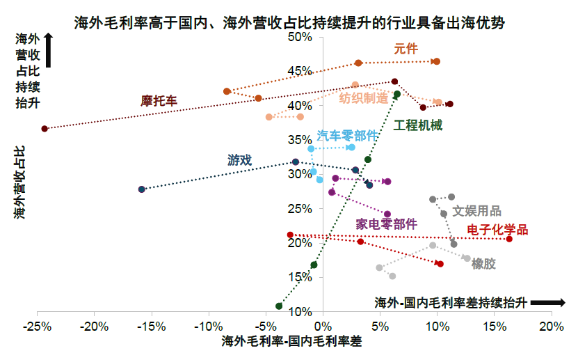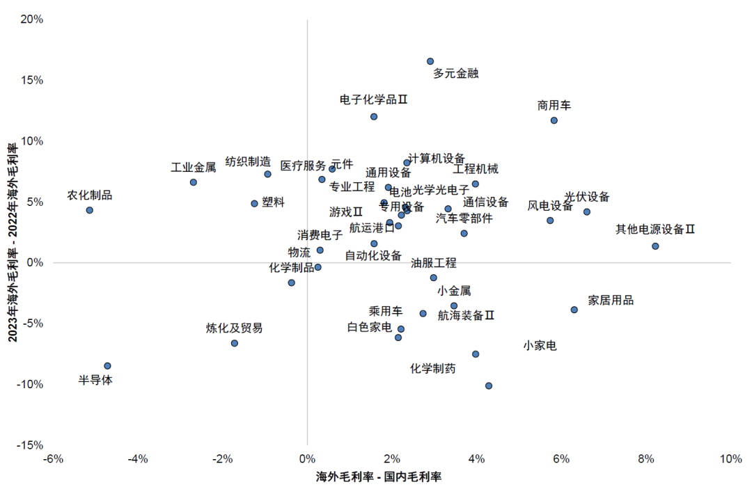 图表12:出口链行业海外毛利率变化及海外毛利率vs国内毛利率
