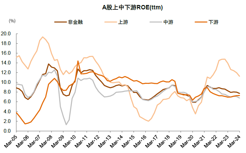 图表8:A股非金融ROE整体有改善空间,下游连续4季度小幅改善