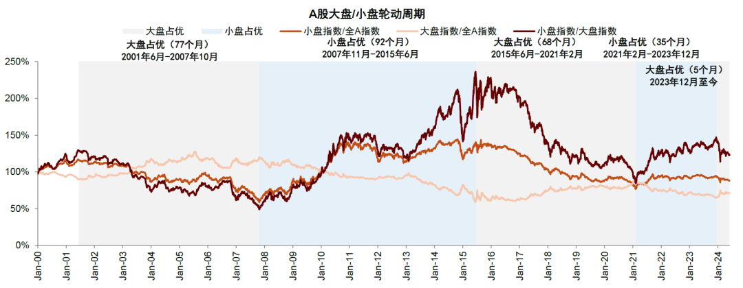 图表29:2021-2023年A股小盘风格连续三年占优,年初至今市场主导风格切向大盘蓝筹