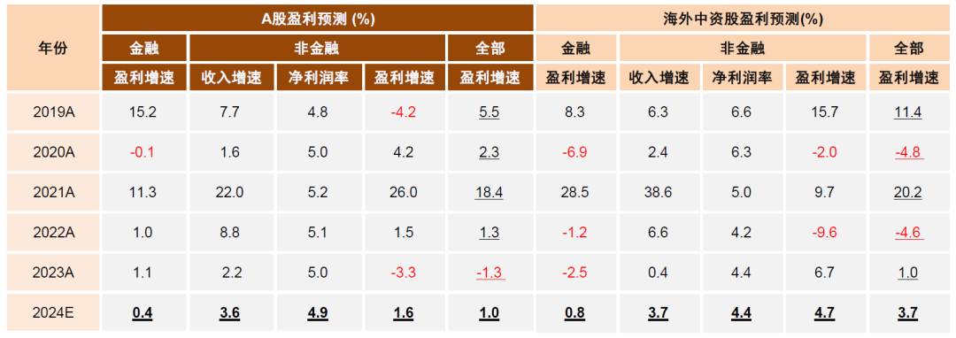 我们预计今年一季度A股盈利增长可能为全年偏低水平,随着物价因素边际改善和复苏的深化,下半年盈利增速可能好于上半年,自上而下估算2024年全年有望实现1%左右的小幅正增长(金融/非金融约为0.4%/1.6%)。