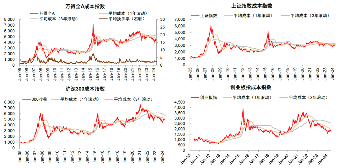 情绪继续修复或需要更多积极因素支撑。根据我们编制的投资者成本指数(以成交量为权重的加权移动平均线),主要指数短期可能面临1年期或者3年期交易密集区域压力。其中,以反映全市场情况的万得全A指数为例,5月份指数高点基本位于1年期成本指数的位置。根据历史经验,指数维持升势往往依赖基本面的催化或者是增量资金入市,后市表现仍需关注增长预期改善节奏。