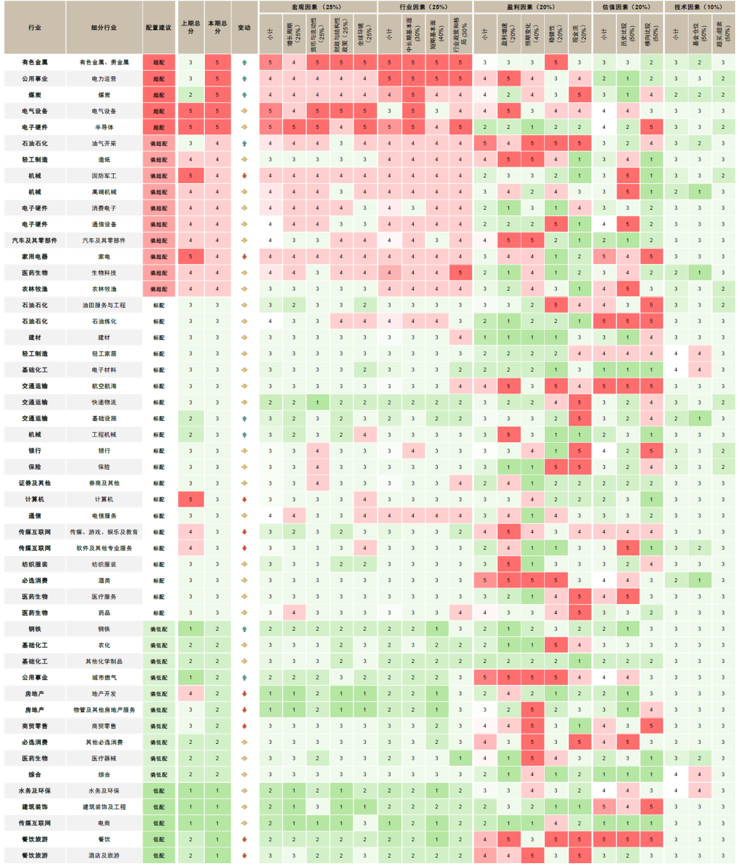 综合对增长及政策的预期、自下而上中金行业分析员的观点,并考虑行业的景气程度及估值等因素,我们更新了行业配置表格。后续仍将根据增长、政策及估值等因素来综合评估及调整配置建议。