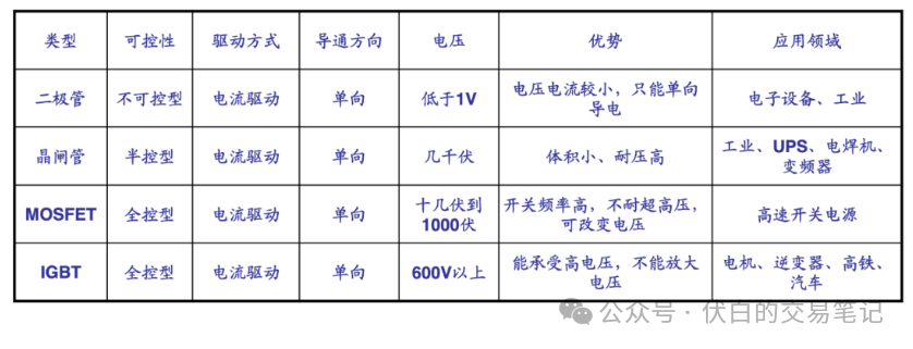 (1)功率器件:体积较大,用于处理高功率和大电压。主要包括二极管、晶体管(IGBT、MOSFET、BJT)、晶闸管等。