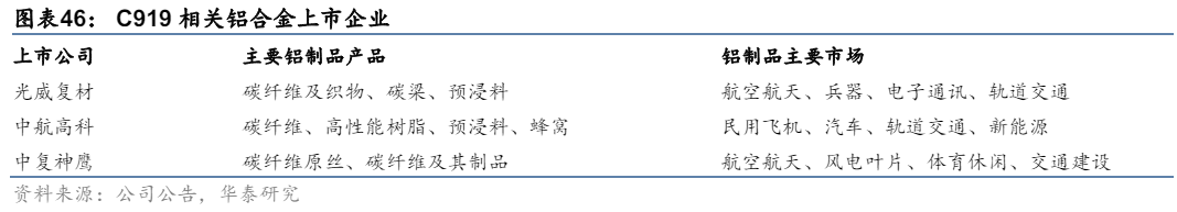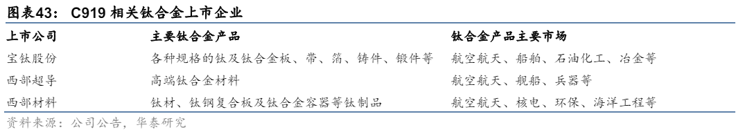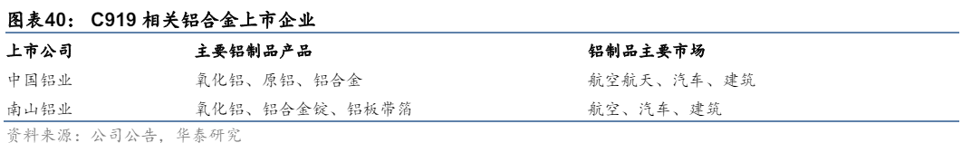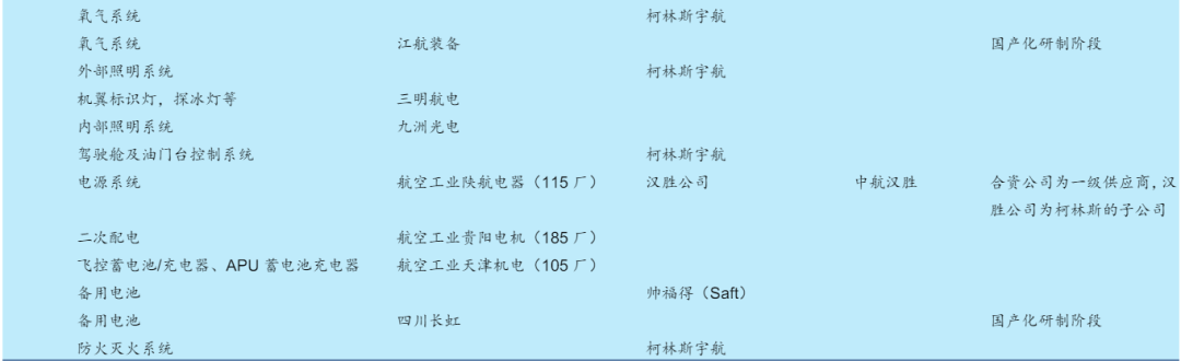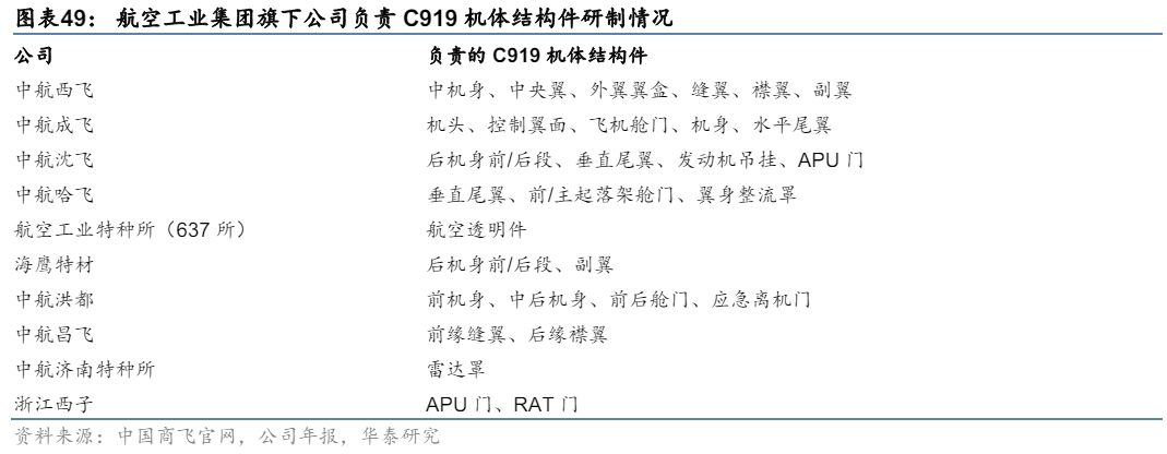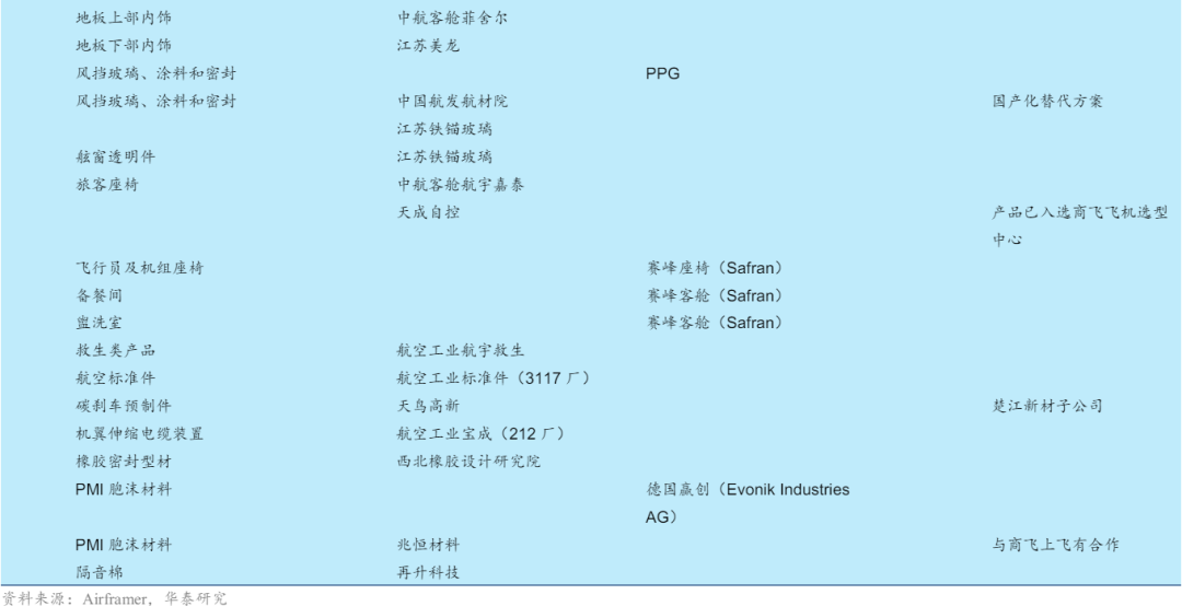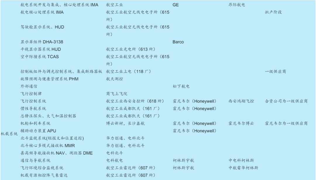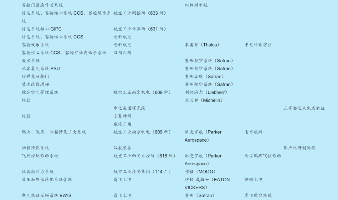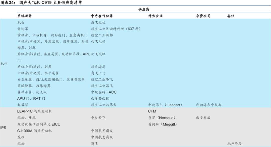 C919 的机体结构主要由国内供应商承制,由中国商飞公司自主设计,航空工业集团成飞、 洪都、西飞、沈飞、哈飞、昌飞,航天特种材料及工艺技术研究所,浙江西子航空工业有限公司等单位共同制造;机载系统主要通过合资公司的形式配套,通用、联合技术、霍尼韦尔等一批欧美顶级航空制造企业以及航空工业集团诸多专业制造公司深度参与其中;发动机目前装备的是由美国通用电气与法国 SNECMA(现赛峰集团)合资的 CFM 国际公司 的 LEAP-1C 发动机。根据 Airframer,我国 C919 大飞机主要供应商如下: