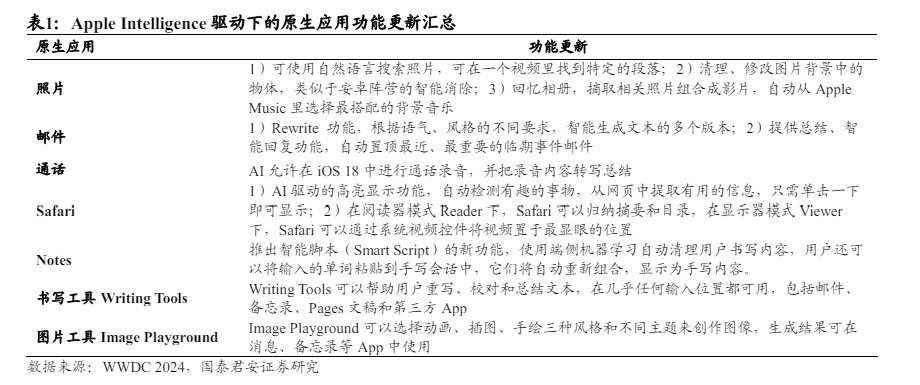 Apple Intelligence与OpenAI深度融合,支持端侧模型训练及推理并结合用户需求实现智能交互,并升级相机、照片、备忘录等常用APP。此外,苹果亦更新Siri语音助手,打通跨APP调用能力,我们认为或将打造新一代“智能体”。更新后的Siri具备更强的语言理解能力,能理解用户屏幕信息并阅读上下文,快速处理日常任务。Apple Intelligence注重用户隐私保护,大部分算力均通过设备端处理,有部分高算力需求也会通过苹果自有AI服务器完成。
