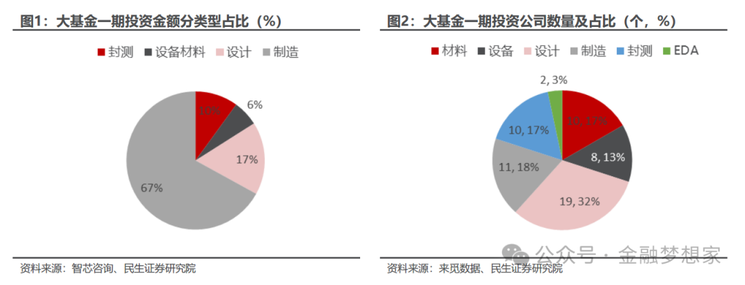 大基金一期成立于 2014 年,规模约为 1300 亿人民币,投资分布大致为集成电路制造占 67%,设计占 17%,封测占 10%,装备材料类占 6%。