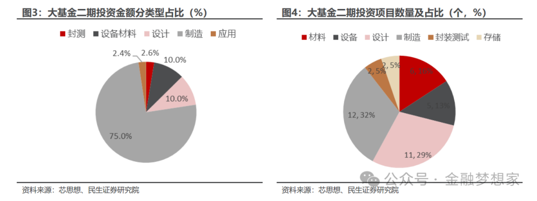 大基金二期投资晶圆制造占比约 75%;投资集成电路设计工具、芯片设计占比 10%;投资封装测试占比2.6%;投资装备、零部件、材料约占比 10%,应用约 19 亿元,占比 2.4%。