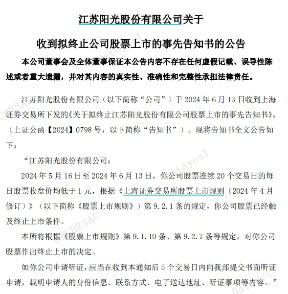 6月13日晚间,ST阳光(600220.SH)(又称江苏阳光,下同)披露关于收到拟终止公司股票上市的事先告知书的公告。公告称,公司于2024年6月13日收到上海证券交易所下发的《关于拟终止江苏阳光股份有限公司股票上市的事先告知书》(以下简称“告知书”)。