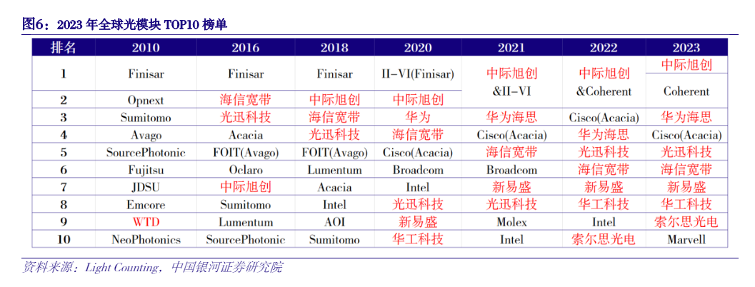 银河证券指出,整体来看,中国厂商在全球光模块市场中占据领先地位,同时随着5G和AI技术的推动,以及运营商和主设备商的创新产品,行业整体收入和市场份额均显示出积极的增长趋势。