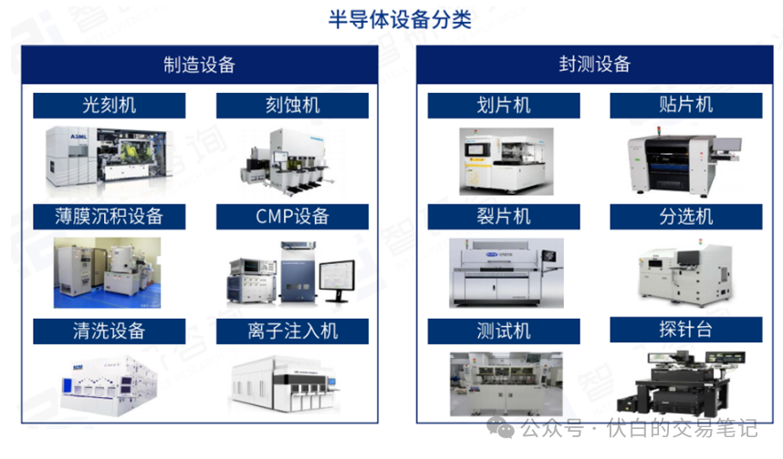 按工艺流程可分为:前道设备(晶圆制造)、后道设备(封装测试)。