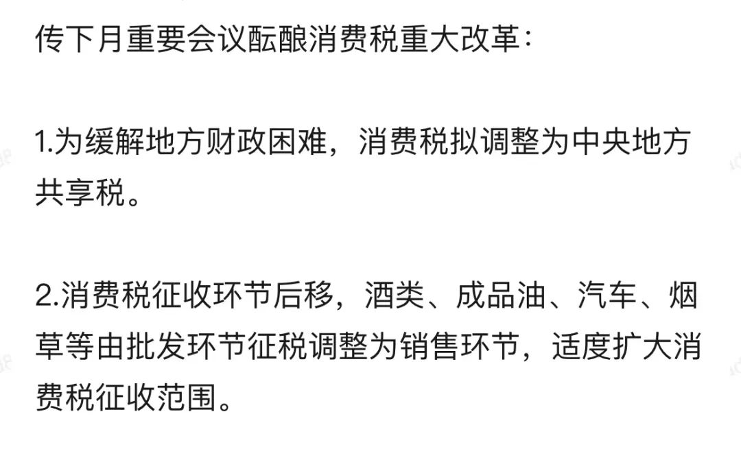 其次,有传闻称下个月有关于消费税的重大改革,主要针对两点:第一点是扩大消费品征税范围,这个不难理解,基数大了,能多收点税。第二点是消费税征收环节改变,从批发环节转移到零售环节。其实还是扩大了征税基数。