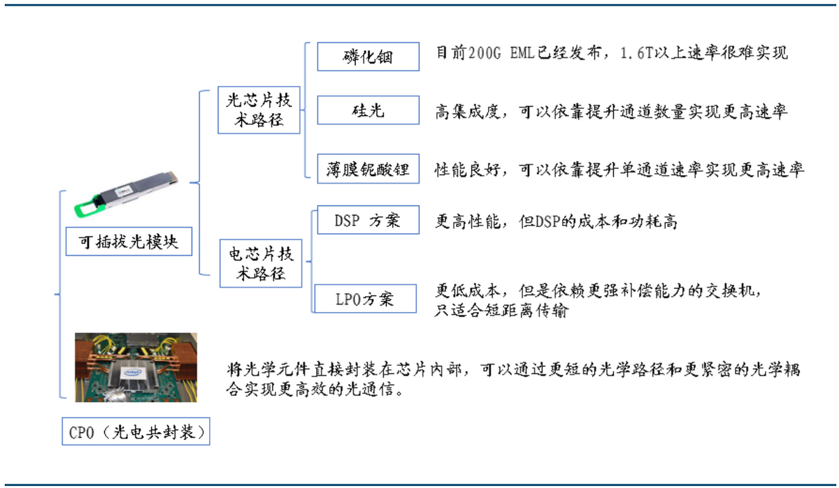 虽然现在光模块封装仍处于可插拔的阶段,但CPO(光电共封装)是更加高速率、低功耗、低延时的封装方式,几乎是公认的发展趋势。