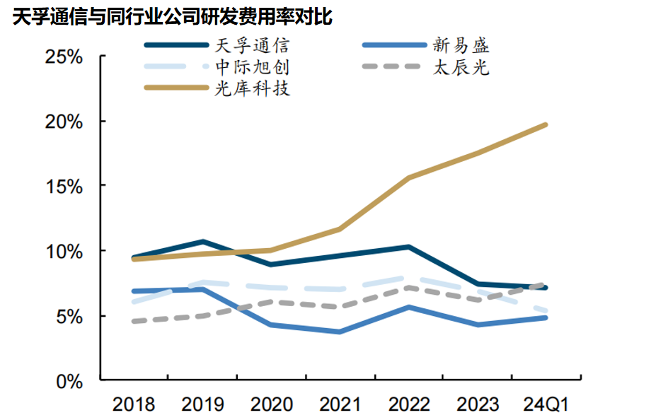 而且从研发情况来看,天孚通信也是下了本钱的。研发费用率虽然不如光库科技,但要高于中际旭创和太辰光,并远超新易盛。研发是在激烈的市场竞争中保持优势必不可少的。