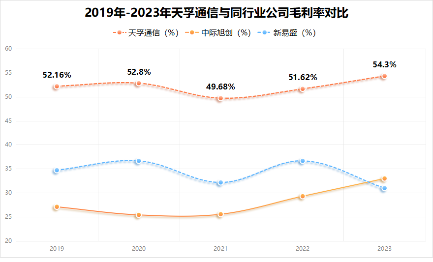 2019年-2023年天孚通信的毛利率始终维持在50%左右的水平,远高于中际旭创和新易盛,并且2021年之后毛利率在逐年上升,从49.68%上升到2023年的54.3%。