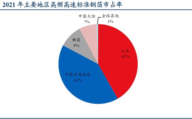 2021年全球高频高速标准铜箔销售量中,大陆企业仅占比7%,而日本企业占比42%,弯弯地区企业占比41%。