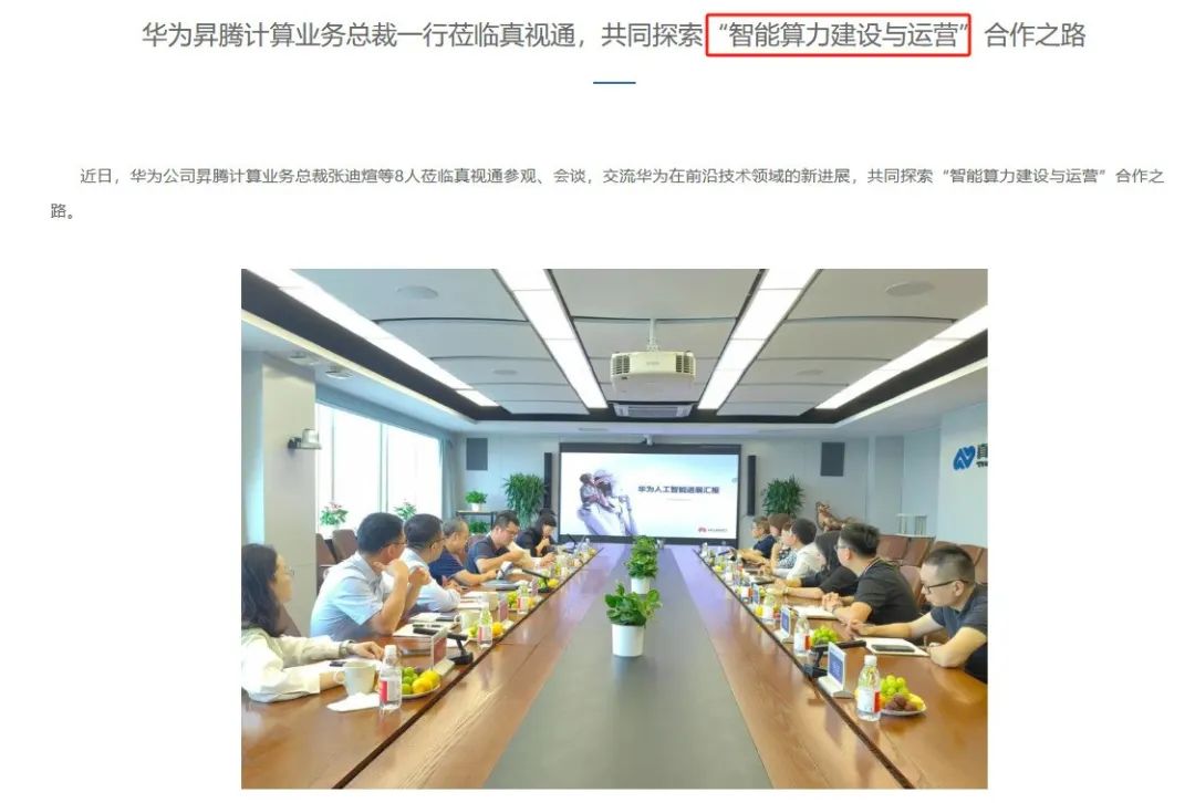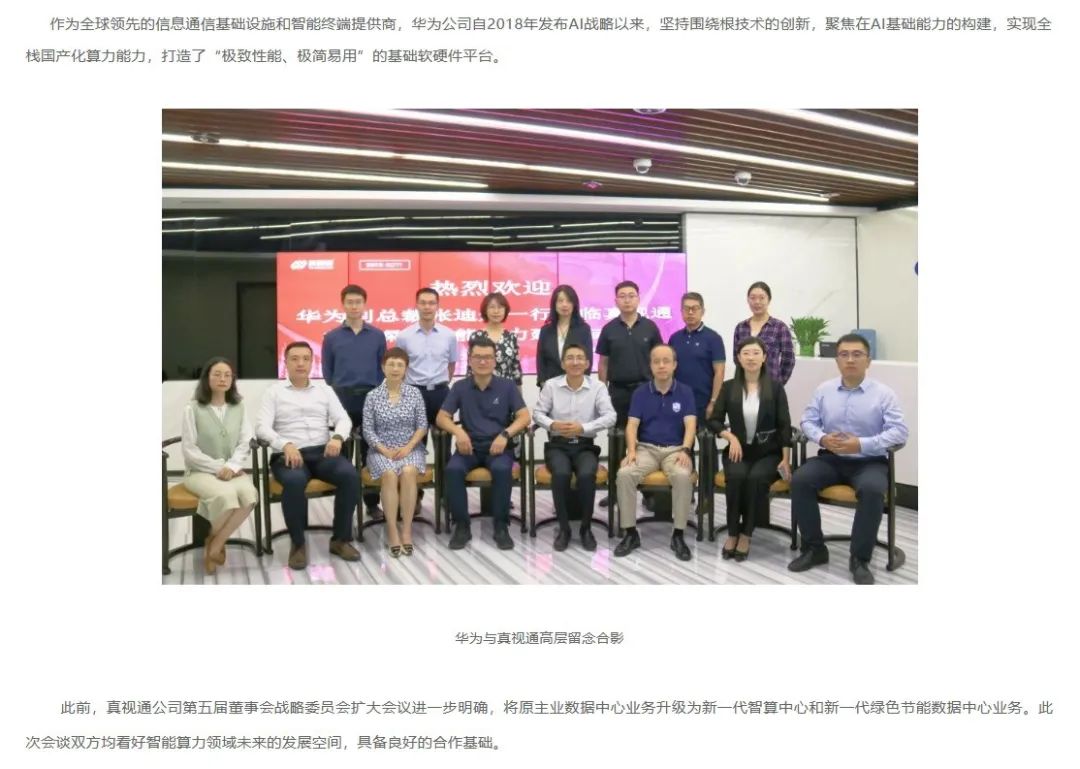 智能算力建设与运营:华为公司昇腾计算业务总裁张迪煊等8人曾莅临真视通参观、会谈,双方共同探索“智能算力建设与运营”的合作之路。真视通将原主业数据中心业务升级为新一代智算中心和新一代绿色节能数据中心业务,与华为在智能算力领域有良好的合作基础。