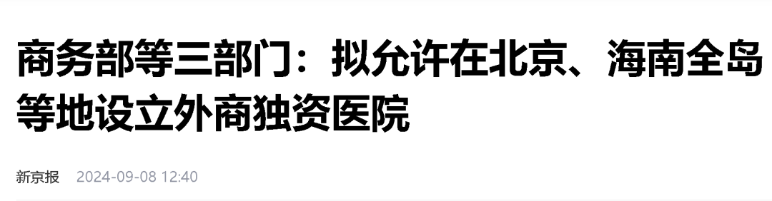 9月8日,有关部门发布相关通知,在北京、上海、广东自贸区和海南自贸港允许外商投资企业从事人体干细胞、基因诊断与治疗技术开发和技术应用。同时,允许北京、天津、上海等多地设立外商独资医院。