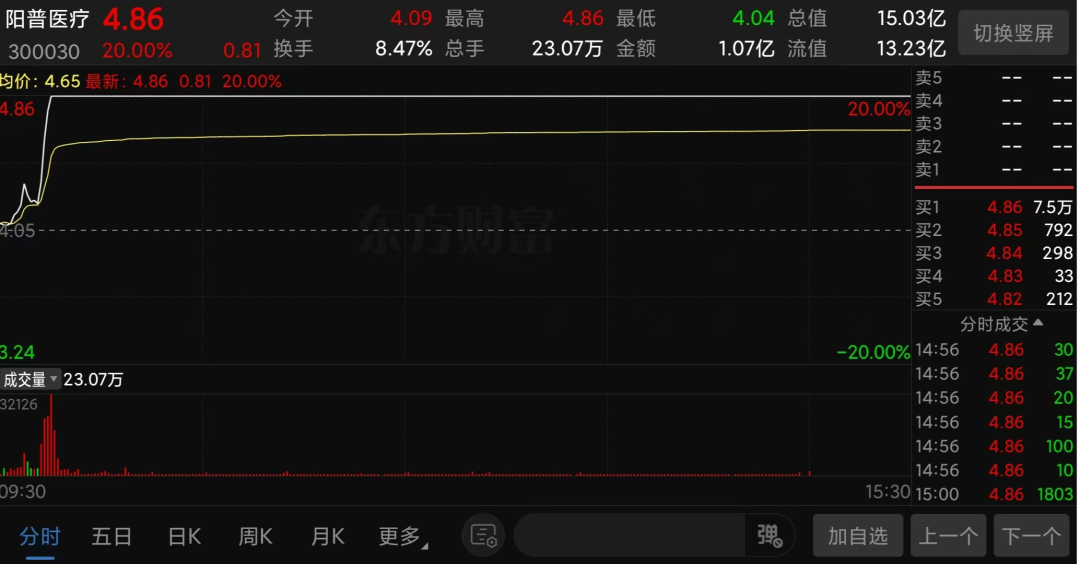 市值最小的阳普医疗涨幅最大,20%涨停!