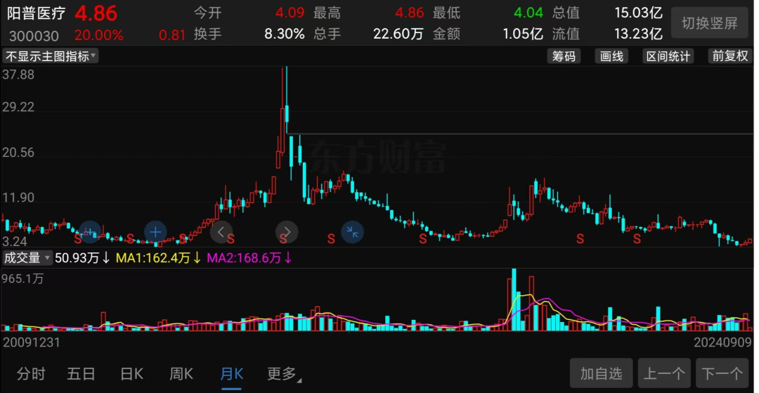 实际上,自2009年上市以来,阳普医疗的股价表现始终不尽人意,跌的时候多于涨的时候,今年7月份刚刚创下3.31元的历史新低,较高位暴跌超90%。