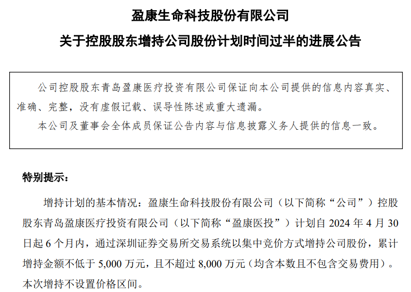 今年4月30日盈康生命公告,控股股东盈康医投计划自2024年4月30日起6个月内,通过集合竞价方式增持公司股份,累计增持金额不低于5000万元不超过8000万元。