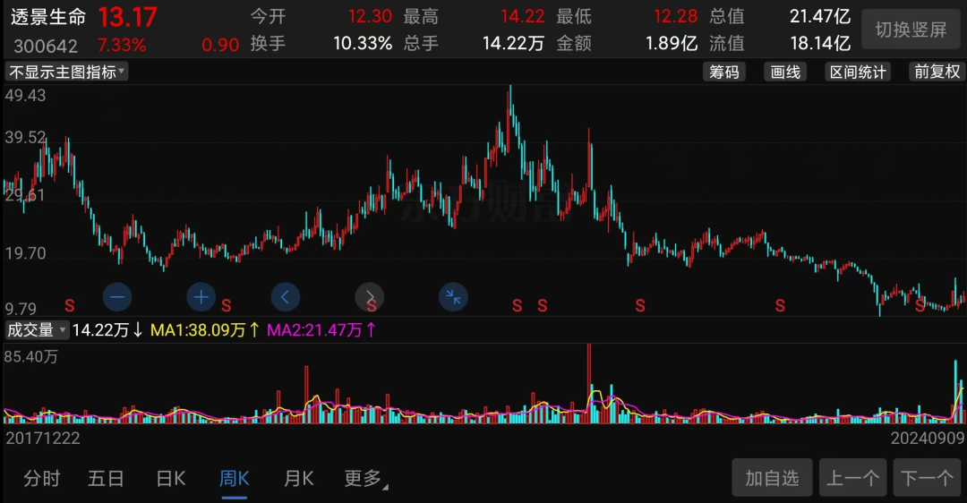 透景生命2017年4月上市,2019年初就差点跌回首日开盘价,然后到2021年上半年涨了一倍多,之后一路下跌,到今年初直接跌破发行价并一路跌至10元以下,然后才有所企稳。