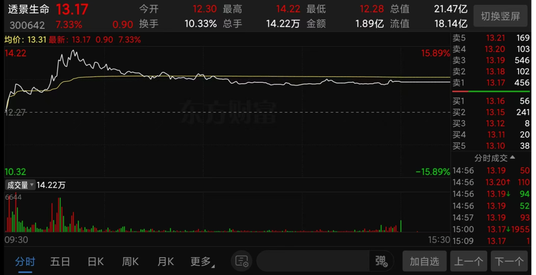早盘开盘半小时后,透景生命也是涨幅较大的一个,盈康生命封20%涨停板的时候,透景生命涨超15%,似乎也要冲击20%涨停板,然而透景生命股价却就此回落,收盘仅涨7.33%。