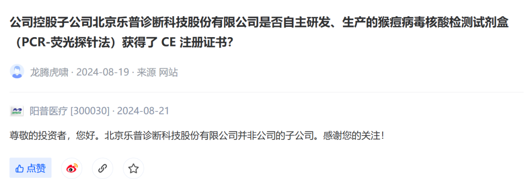 不过,好像有人把阳普医疗和乐普医疗有点分不清楚。前段时间,有投资者在阳普医疗互动平台询问时认为乐普诊断是阳普医疗的子公司!
