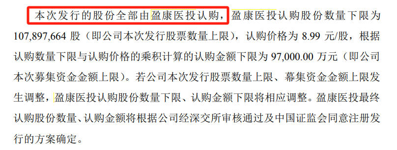 除了增持盈康生命之外,控股股东盈康医投还全额认购了盈康生命的增发。8月27日,盈康生命发布的最新版增发募资说明书显示,发行对象为盈康医投,发行的股票全部以现金认购,最低认购金额为9.7亿。