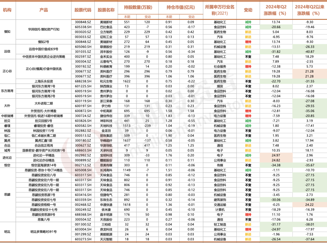 明汯增持了基础化工领域的鼎龙科技,远信、慎知、思勰、翼虎、拾贝则分别减持了相关领域的润丰股份、美瑞新材、长鸿高科、华峰超纤、坤彩科技。
