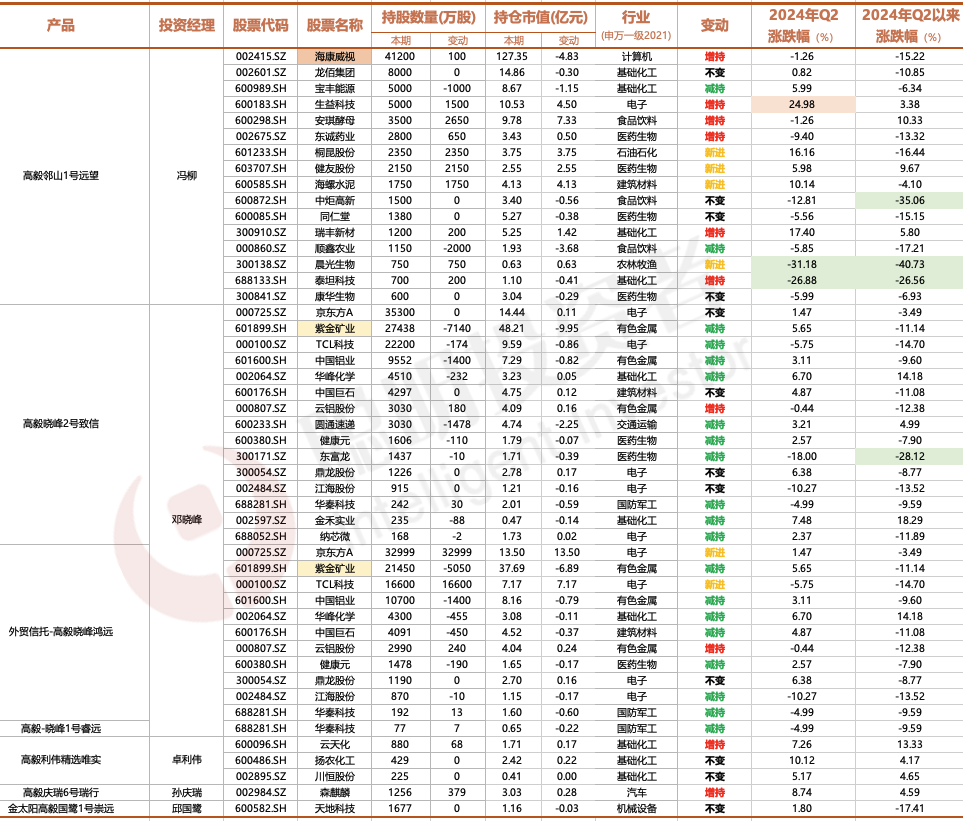 二季度冯柳还增持了生益科技、安琪酵母、东诚药业、瑞丰新材和泰坦科技,新进了海螺水泥、桐昆股份、健友股份以及晨光生物的前十大流通股东名单,但减持了宝丰能源和顺鑫农业。