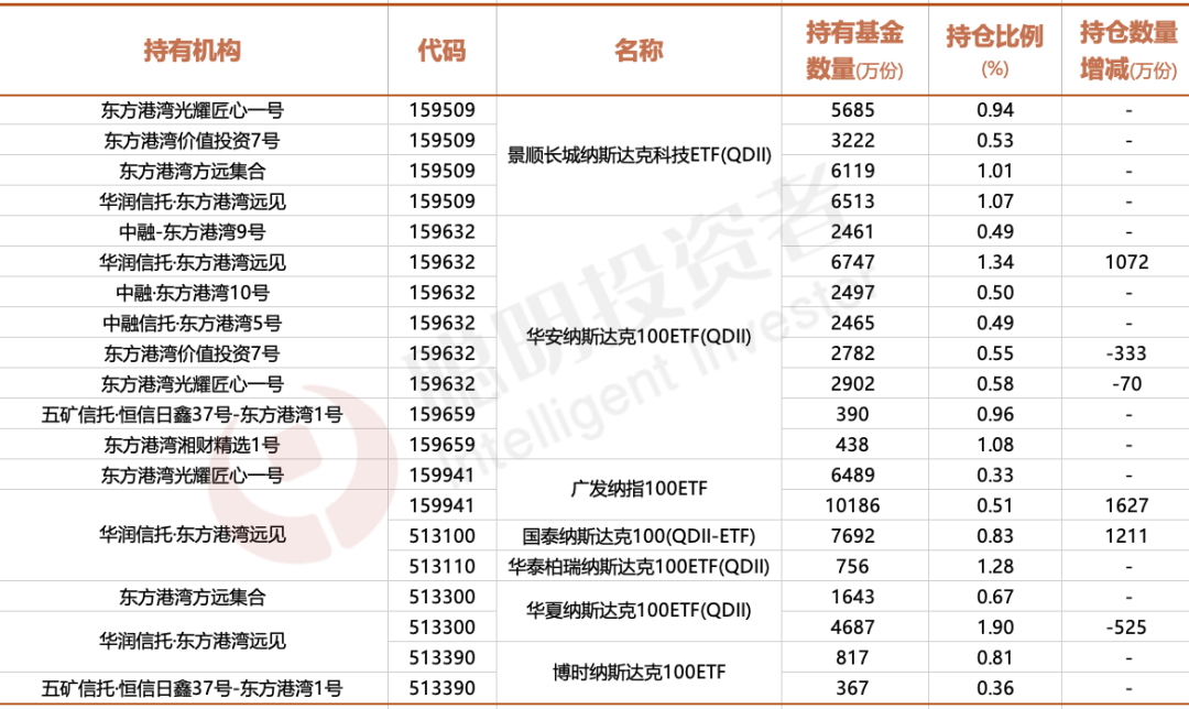 从中报中透露的数据看,东方港湾围绕纳指100ETF和纳指科技ETF配置了个遍,大举买入了景顺、华安、招商、广发、国泰、华泰柏瑞、华夏以及博时等7家公司旗下的各种ETF,二季度甚至又增持了几只,而且这几只产品今年以来的涨幅亮眼,应该是为但斌的组合贡献了不少。