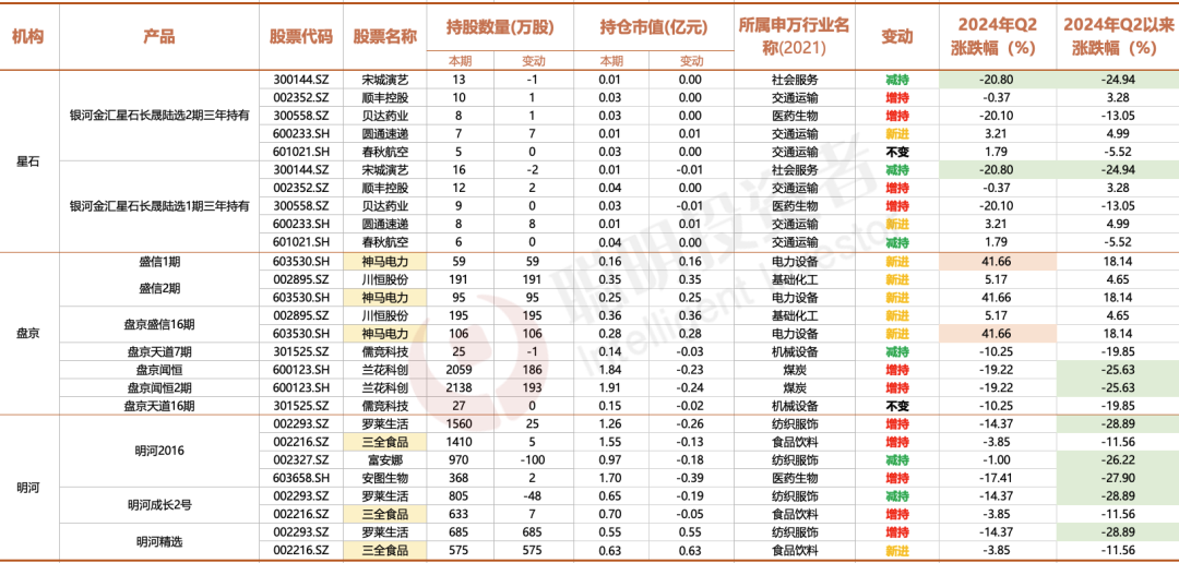 星石、盘京、明河截至2024中报时的部分持仓变动
