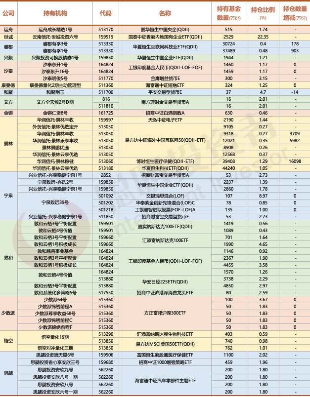 工银印度基金人民币同时被汐泰、敦和资管的多只产品持有,敦和有两只产品还持有华安日经225ETF;景林旗下的多至今现身易方达中证海外中国互联网50ETF的前十大持有人名单,而且二季度时大幅增持;悟空投资则出现在汇添富纳斯达克生物科技ETF和易方达MSCI美国50ETF的前十大。