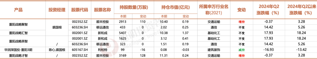 二季度,重阳战投增持顺丰控股,由裘国根掌舵的重阳战略聚智和重阳战略英智,分别位列维生素龙头新和成的第三大和第八大流通股东,二季度的持股数量不变,期末的持股市值超13.5亿。