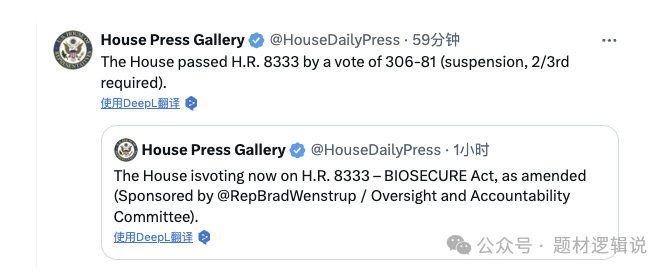 美国众议院当地时间9月9日宣布,以306票对81票通过了H.R.8333号法案,即《生物安全法案》(The Biosecure Act)。该法案以“国家安全”为由,限制美国联邦机构与外国生物技术公司展开业务往来,并点名了5家中国公司,分别是中国合同研究组织(CRO)巨头药明康德、其姊妹公司药明生物、华大基因集团、华大基因关联公司华大智造以及华大基因子公司Complete Genomics。