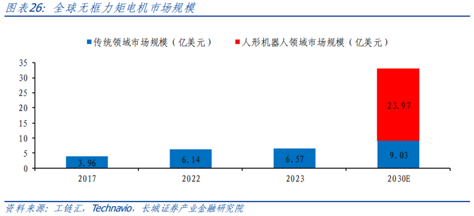 根据海外市场研究公司Technavio数据,2023年全球力矩电机市场规模增长6.95%至6.57亿美元,市场空间较小。未来随着人形机器人逐步放量,无框力矩电机市场规模有望快速增长。若以2030年人形机器人出货量达100万台,同时无框力矩电机产品单价下降一半到500元/台来估算,预计人形机器人领域无框力矩电机市场空间将达到23.97亿美元,叠加传统领域市场空间的平稳增长,总市场规模有望达到33亿美元。