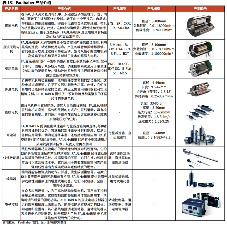 2)Faulhaber:产品矩阵完善。公司产品包括直流电机、直流无刷电机、线性电机、步进电机等,以及减速箱、线性致动器、编码器、电子控件等,每种驱动系统都致力于在实现最小尺寸和最轻质量设计的同时达到最大性能。 产品应用于高精尖领域,产品背书优秀。公司为医疗设备、航天航空、高精密光学仪器、机器人和自动化等高标准应用领域提供定制产品以及技术方案。