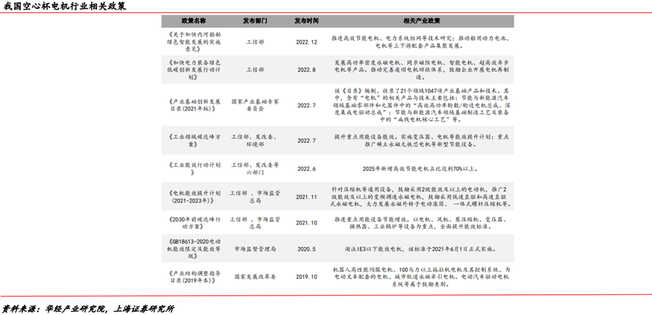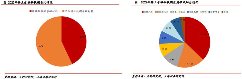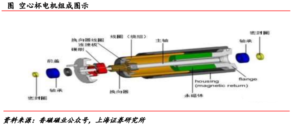 在原材料中,空心杯电机的永磁材料以高端钕铁硼(第三代稀土永磁)为主,2022年钕铁硼永磁材料中高端型占比43%。不同永碰体的特点和性能存在差异,在保证产生的磁场稳定的同时,需根据应用场县对工作温度、环垃的要求,合理的配置永磁材料,达到电机的性能和成本效应最大化。