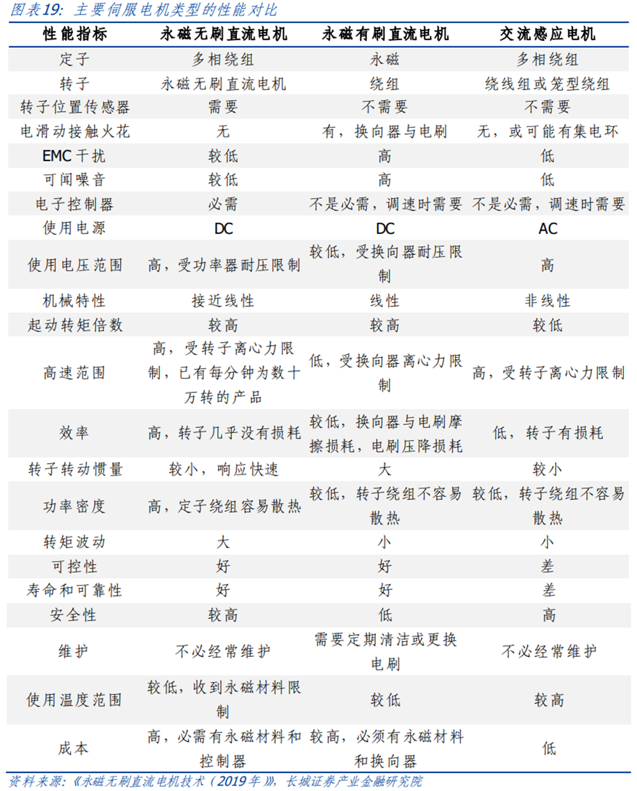 根据控制电源的不同,可以分为直流伺服电机和交流伺服电机。其中直流伺服电机根据是否具有电刷,又可以分为有刷直流伺服电机和无刷直流伺服电机。对比三种类型电机,可以看到直流伺服电机具有控制精准,转矩特性、线性调节特性较好,使用方便且价格便宜等优势。无刷直流伺服电机以电子转向器取代机械转向器,减少摩擦和噪音、延长寿命且安全性,但是一定程度增加了成本。根据《永磁无刷直流电机技术》一文,目前在航空航天和军事装备、工业自动化等领域,有刷直流伺服电机正在逐步被无刷直流伺服电机所取代。