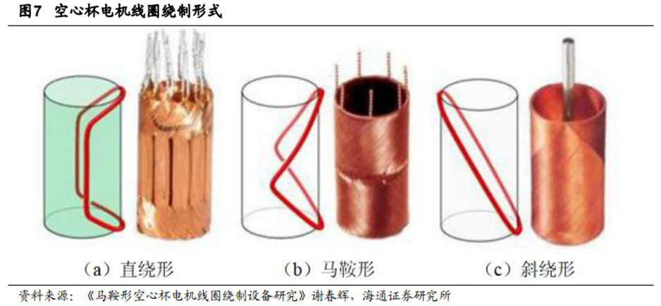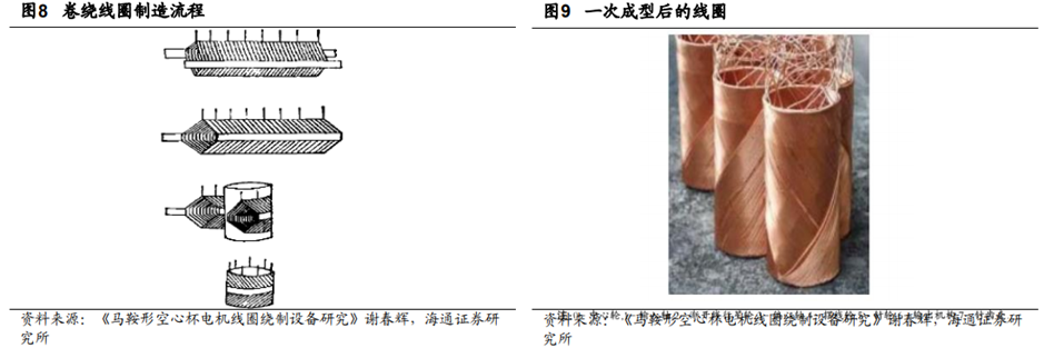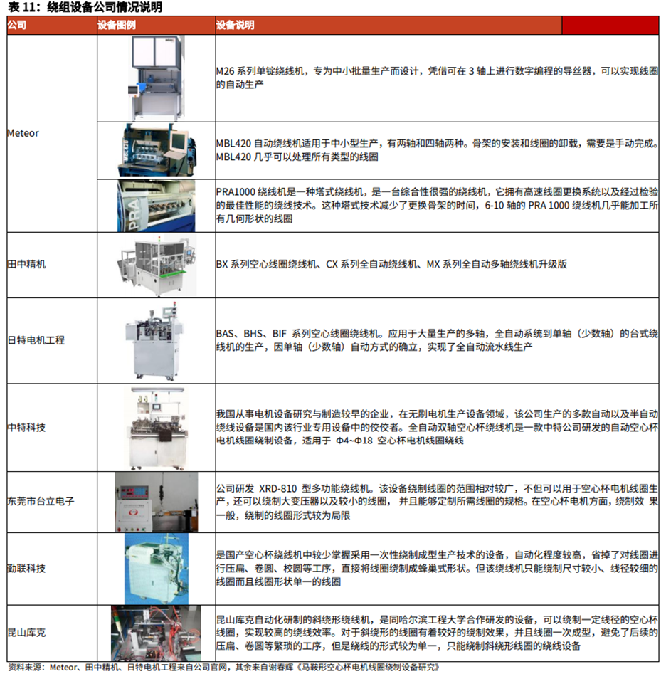 绕线设备国外领先,国内企业起步较晚。作为电机制造行业鲜明的代表,瑞士的Meteor公司是全球占有率较高的绕线机供应商。Meteor在该行业具有较为先进的技术和强大的研发实力,研制出诸多类型的线圈绕制设备,攻克了较多技术上的难题,在多个方面有着独特的解决方案。另外,作为世界绕线机生产的鼻祖,日本田中精机株氏协会,第一个将计算机控制用于全自动绕线机上,发明了磁铁无摩擦张力器,研发出CNC可翻转的多轴绕线设备。受到空心杯电机关键技术和工艺的制约,其中核心技术即线圈的设计、绕制工艺以及绕制设备,先进的技术和工艺设备一直被德国、瑞士等少数发达国家所垄断,同时国外的高质量设备价格昂贵,我国对空心杯电动机制造设备的研发愈发重视,如中特科技、台立电子、勤联科技、昆山库克自动化等均有绕线设备产品。但是现有线圈绕制设备问题,包括一次成型的自动化绕制设备较少,马鞍形线圈多为卷绕式的成型方式,现有自动化的绕制线圈的类型多为斜绕形,且在线圈两端的质量较差等一系列问题。