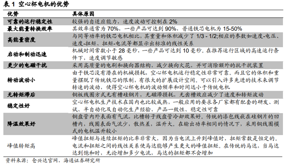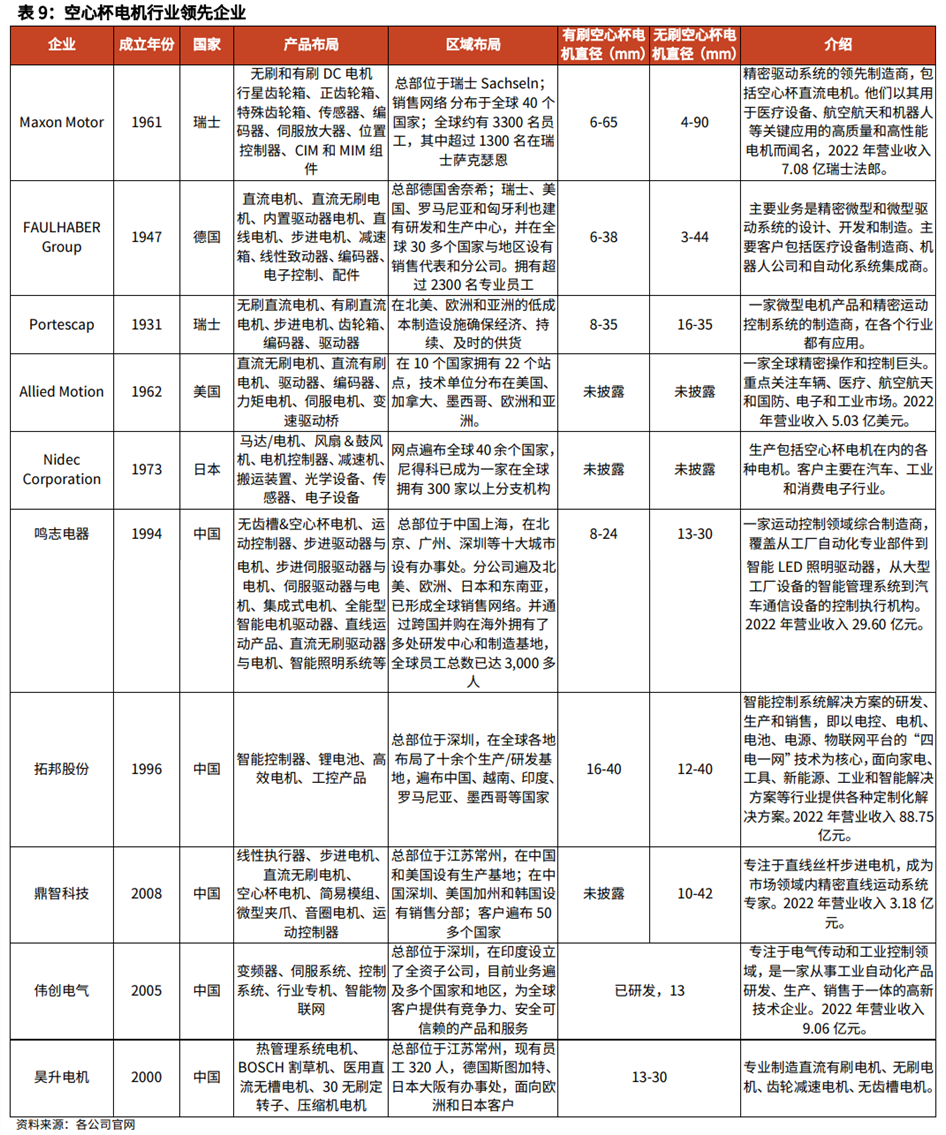 国外空心杯电机排名前列的公司分别是Maxon Motor、Faulhaber、Portescap、Allied Motion Technologies、及Nidec Copal Corporation;国内空心杯电机龙头公司是鸣志电器,拓邦股份、鼎智科技、伟创电气、昊升电机也是重要的空心杯电机公司。