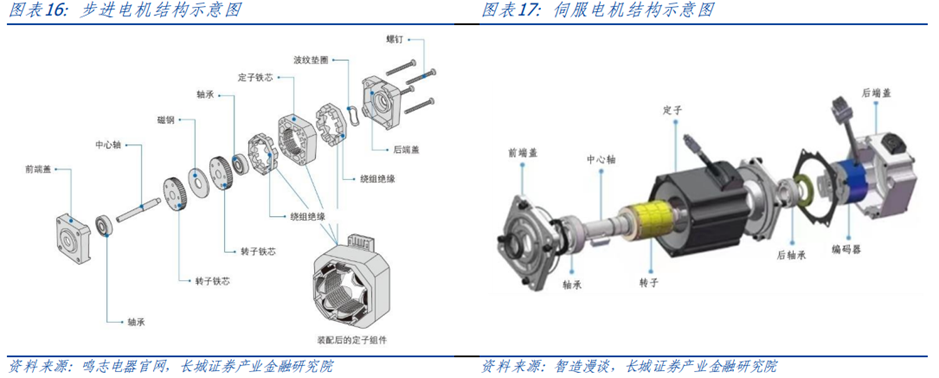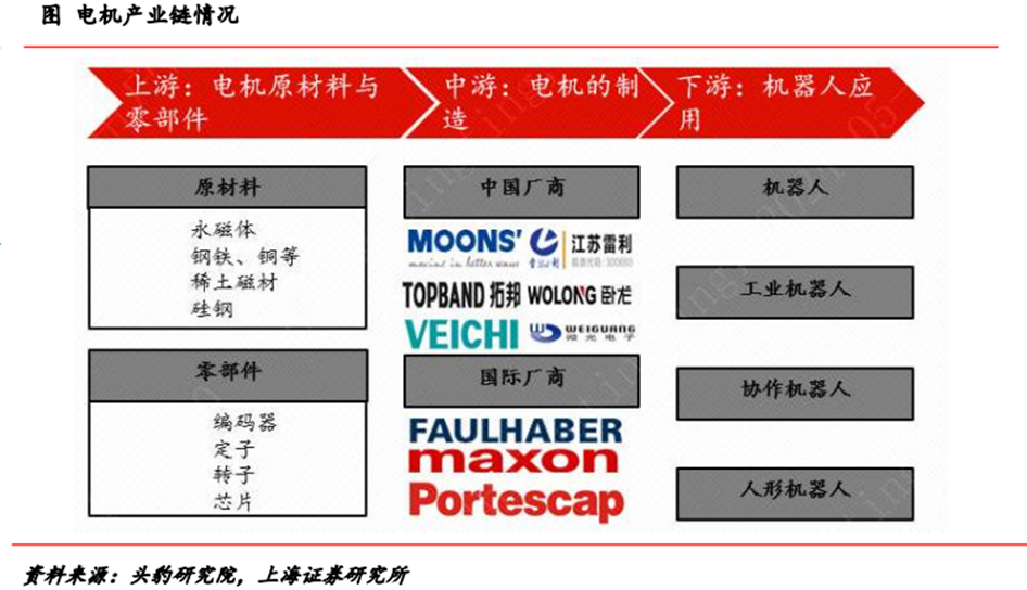 电机的上游主要是磁性材料、编码器、芯片和轴承等其他零部件,中游是电机制造,下游是机器人等行业应用。