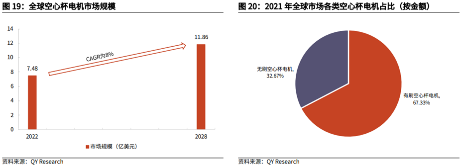 2022年空心杯电机全球市场规模超50亿元人民币。根据QY Research数据:全球空心杯电机市场规模在2022年约为7.48亿美元,折合人民币约53.56亿元(以美元/人民币=7.16的汇率进行折算),预计到2028年将达到11.86亿美元,2022-2028年复合年增长率为7.98%;若进一步区分有刷和无刷,2021年全球有刷空心杯电机市场规模占全球空心杯电机市场规模比例(按金额)为67.33%,并预计到2028年有刷空心杯电机全球市场规模将达到6.86亿美元,2022-2028年复合增长率为5.68%。