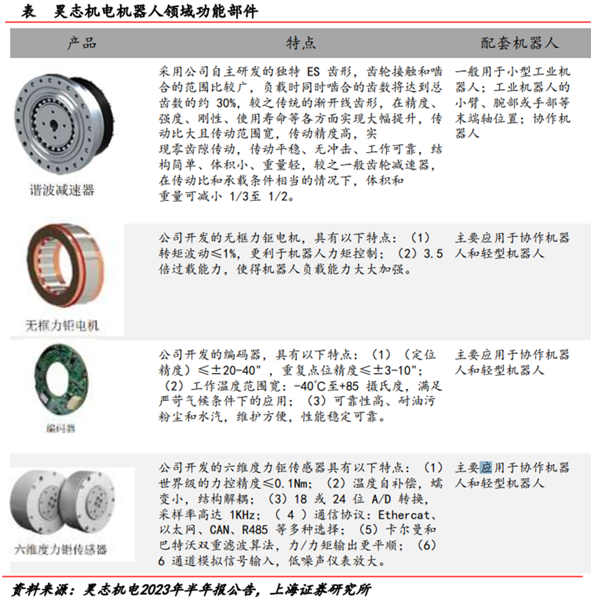 根据公司披露的2023年年报,公司的谐波减速器、机器人关节模组、末端执行机构(气动手指和快换模块)等产品能够满足协作机器人、轻型机器人生产的模块化、标准化、小型化要求,具有较好的市场前景。凭借在机器人领域深厚的技术积累,公司先后攻克了智能机器人用“高性能谐波减速器”、“高精度编码器”、“一体化关节模组”、“六维力传感器”、“控制系统”等一系列核心功能部件技术,打破了智能机器人核心功能部件依赖进口的局面,实现了智能机器人核心功能部件的全国产化。公司与客户共同开发的按摩机器人,已成功应用于美业专业连锁机构。