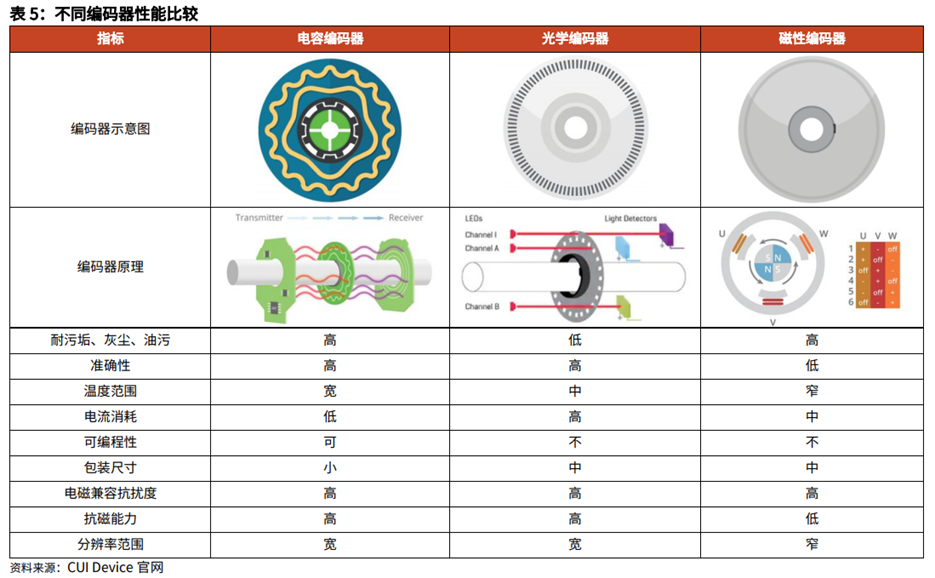 编码器的分辨率和精度与电机运动控制性能有着密切的联系。编码器是将信号进行编制、转换为可用以通讯、传输的信号形式的设备,如为伺服电机的闭环控制产生速度或位置的实际测量值。编码器种类繁多,按照读出方式可分为接触式和非接触式两种;按照检测工作原理,分为磁性编码器、光学编码器、电容编码器。磁性和光学编码器目前应用较为广泛,而CUI Device的电容编码器则可以应用在工业、自动化、机器人和可再生能源领域,未来高精度、环保型控制场景有望推动电容式编码器的提升。