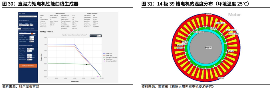 无框力矩电机的壁垒体现在磁路和工艺设计。转矩密度、功率密度是影响机器人性能的重要指标,能够通过调整电流、电压、环境温度和绕组等因素,在低压供电的环境下输出较大的功率,以快速优化电机,实现卓越性能,提高转矩能力。海外厂商具有悠久的发展历史和正向研发能力,能够通过产品和经验积累、模拟仿真软件快速实现产品设计,以满足客户需求。在以上方面,国内企业尚有一定差距。