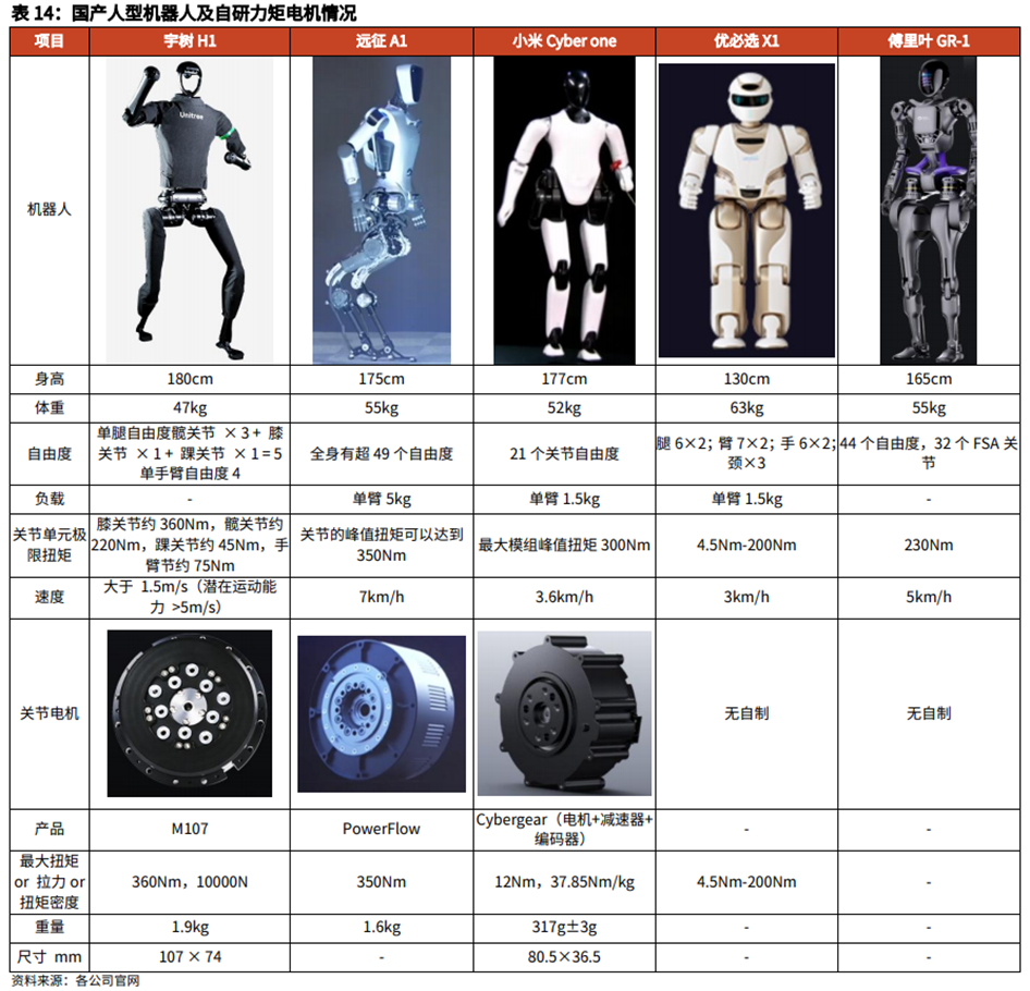 国产人形机器人如宇树H1、远征A1、小米Cyberone、优必选X1、傅里叶GR-1,关节单元也都使用无框力矩电机,最大扭矩为360Nm。宇树、智元、小米机器人均自研关节电机,能够更好适配各自厂商的机器人产品。
