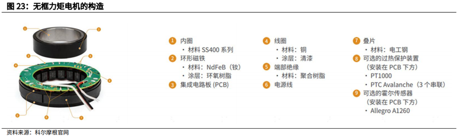 科尔摩根无框力矩电机典型构造:(1)内圈采用SS400系列(抗拉强度为400MPa的普通结构钢);(2)环形磁铁采用NdFeB,涂层采用环氧树脂;(3)集成电路PCB板;(4)线圈材料铜、涂层是清漆;(5)绝缘材料是合成树脂;(6)电源线;(7)叠片选用电工钢;(8)可选过热保护装置(PT1000铂热电阻、PTC热敏电阻);(9)可选霍尔传感器。