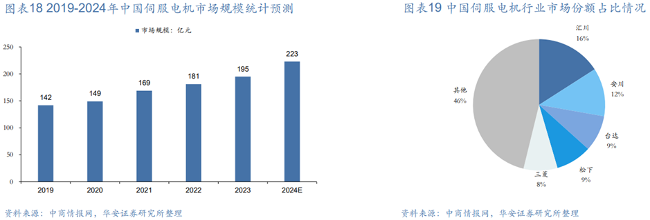受益于需求扩张,我国伺服电机市场保持稳健增长。近年来,受到下游工业机器人、电子制造设备等产业扩张的影响,中国伺服电机市场规模一直保持增长趋势。与此同时,伺服电机在新兴产业应用规模也不断增长。根据中商产业研究院发布的《2023-2028年中国伺服电机行业分析及发展预测报告》,2024年我国伺服电机市场规模将超200亿元。