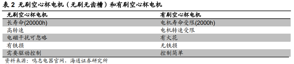 无刷电机:无刷空心杯直流电机采取电子换向,线圈不动,磁极旋转。无刷空心杯直流电机,是使用一套电子设备,通过霍尔元件,感知永磁体磁极的位置,根据这种感知,使用电子线路,适时切换线圈中电流的方向,保证产生正确方向的磁力,来驱动电机。因为是自控式运行的,所以不会像变频调速下重载启动的同步电机那样在转子上另加启动绕组,也不会在负载突变时产生振荡和失步。 无刷电机具有噪音小、寿命长、易维护等特点,或是未来发展趋势。
